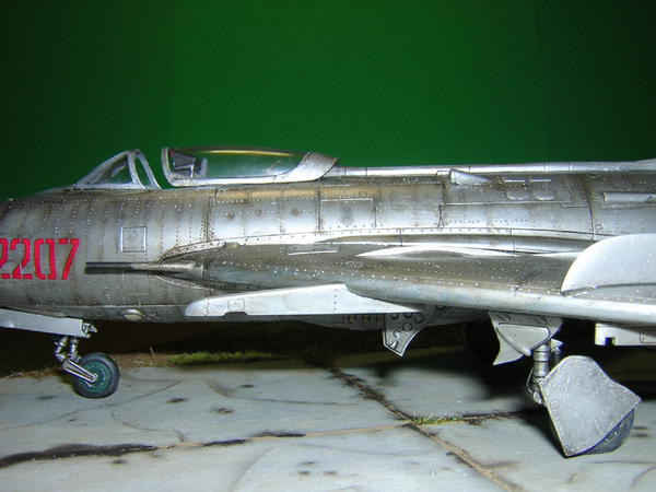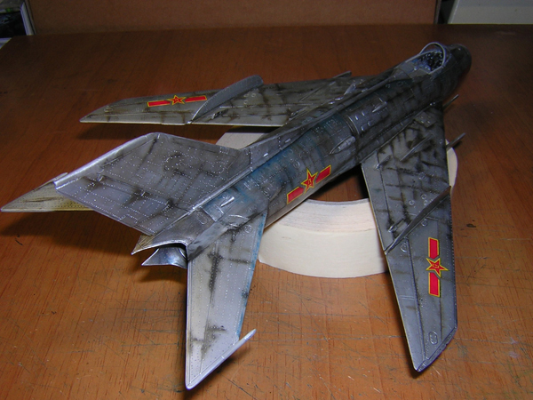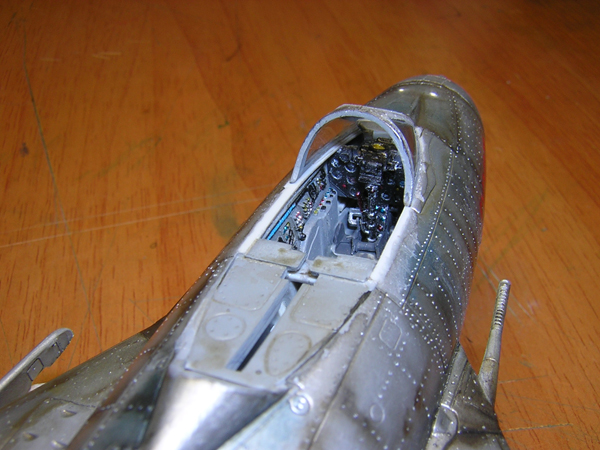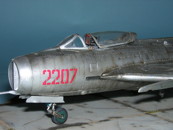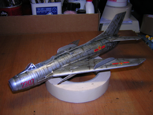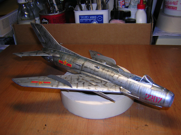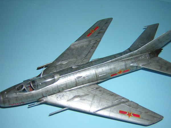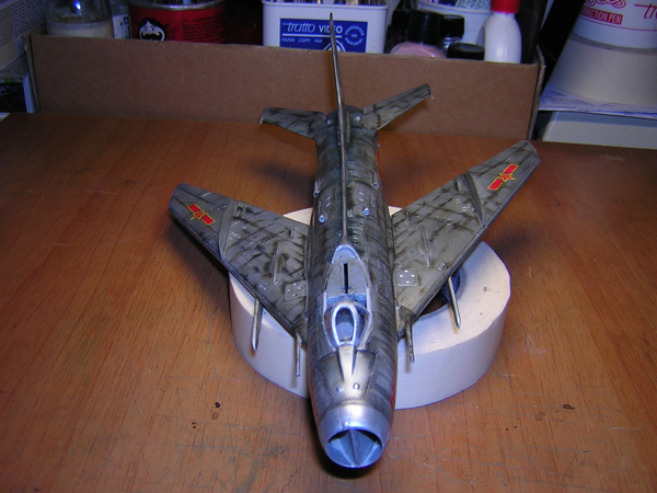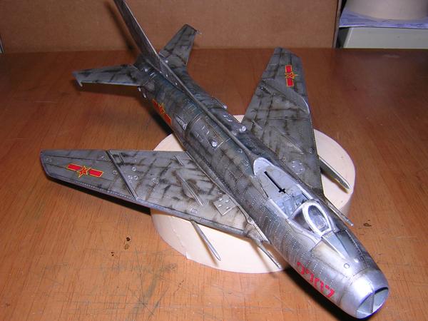 Versione. Ho scelto quella cinese chiamata Shenyang F6, in natural metal con poche insegne. Mi ha stuzzicato l’idea del metallo naturale per provare i famosi Alclad. Dopo aver mascherato qualche particolare, ho tirato fuori dal cassetto un aerografo non molto usato. I colori Alclad non necessitano di diluente, basta agitare per bene, versare nel contenitore e spruzzare. L’effetto mi è sembrato subito buono, peraltro evidenziato dalla numerosa centinatura presente sul velivolo.