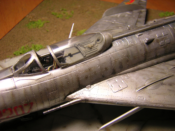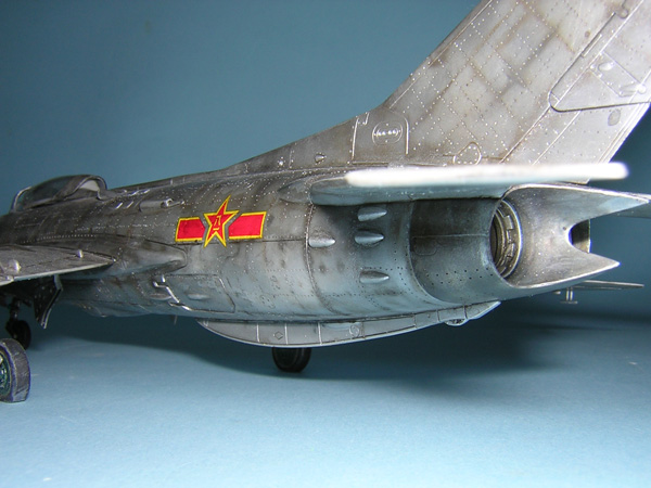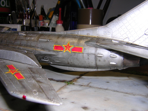 Dopo aver applicato le decals (senza fare uso di alcun lucido preventivo) è sorto il problema di come rendere l’aereo meno giocattoloso. Ho trascorso diverso tempo ad osservare le foto per stampare in memoria alcuni dettagli; usure, perdite idrauliche, tutte cose che caratterizzano ogni aereo e che diventano divertimento per i modellisti. Solo quando ho chiaro in mente l’immagine dell’aereo che voglio riprodurre (e mi riferisco alla sua condizione operativa) prendo i colori per ombreggiare e invecchiare. Gli Alclad hanno il pregio di sopportare bene i diluenti sintetici e consentono di fare numerosi passaggi senza timore di portare via il metallo. Cosi mi sono lanciato nell’opera facendo uso di pennelli e piccole dosi di colore, opportunamente sfumato. Le immagini qui sotto illustrano progressivamente le varie fasi dell'invecchiamento.