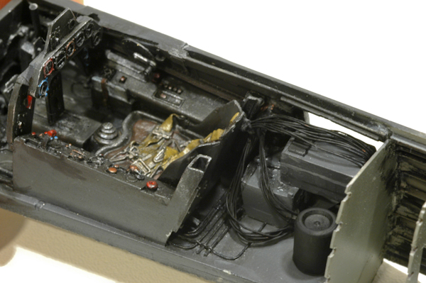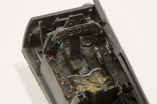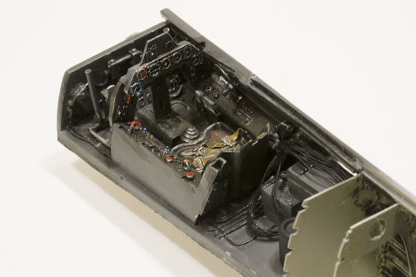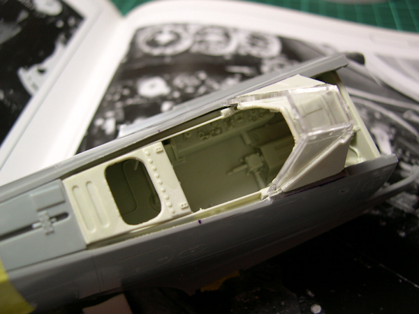 barrettine di ottone con un profilo a T. Quest'ultima soluzione è forse la più difficile da gestire ma sicuramente la resa qualitativa rispetto alla struttura reale dell'aereo è notevole. Alla fine, ormai al limite dell'impazzimento, son riuscito a far combaciare il tutto e a chiudere in qualche maniera la fusoliera della mia bella Dora. A questo punto mi sono dedicato alla verniciatura dell'abitacolo. Ho utilizzato il classico RLM 66 antiriflesso della Luftwaffe (Gunze H416), utilizzando foto dell'epoca per rappresentare al meglio: quadranti, leveraggi e componentistica varia del cockpit. |