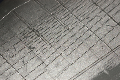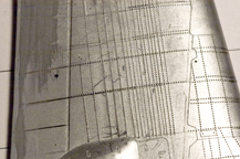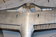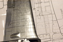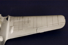 In realtà il lavoro, una volta disegnato lo schema della rivettatura, non è particolarmente complicato. Il tape della dymo svolge egregiamente il suo ruolo di guida ed il rivettatore " Rosie " devo dire altrettanto. Unico consiglio che mi sento di dare a chi volesse cimentarsi in questo splendido sport è quello di utilizzare il rivettatore 1:32 della dimensione più piccola. Questo semplicemente perchè avendo deciso di rivettare il modello una volta che questi era già assemblato, le minori dimensioni della rotellina rivettatrice consentono di seguire più facilmente le curve del modello. Per il resto il lavoro procede speditamente e ora dopo ora vedrete il vosto modello cambiare aspetto sotto i vostri occhi; è incredibile come questo "semplice" intervento possa trasformare il nostro modello, conferendogli un aspetto molto più relistico. Qui a fianco potete vedere un ingrandimento della superficie alare ed il notevole grado di dettaglio che possiamo conferire ad essa mediante questa tecnica di dettaglio. |
