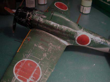 Eccoci finalmente alla fase che prediligo! Il modello è quasi del tutto montato e verniciato. Potrebbe già fare la sua bella figura sulla basetta appena preparata per lui, ma....manca ancora qualcosa, un qualcosa che dia la vita al nostro lavoro! E' il momento di invecchiare! La qualità scadente delle vernici giapponesi e le condizioni di esercizio proibitive in cui questi velivoli andavano ad operare durante la guerra del pacifico facevano sì che le livree di questi velivoli andassero incontro ad un precoce invecchiamento naturale, mostrando velocemente ampie scrostature e marcate disomogeneità. Un modo abbastanza semplice per ricreare queste ampie scrostature in un modello statico è quello di asportare con del nastro adesivo non troppo tenace lo strato superficiale di vernice. Come già ho precedentemente spiegato la prima fase di verniciatura del modello è consistita nell'aerografare su tulla la fusoliera e sulle ali uno strato di flat alluminio XF16 della Tamiya; successivamente ho sovrapposto il verde scuro XF70 definitivo, sempre della Tamiya. A questo punto, iniziando la fase dell'invecchiamento, ho iniziato ad usare del nastro Tamyia per mascherare. La tecnica è semplice, bisogna avere molta pazienza. Si appoggia il nastro sulla vernice, sia aspetta qualche istante e si strappa con decisone. Ad ogni operazione così effettuata, piccole scaglie di vernice si distaccano dal modello lasciando trasparire l'allumino al di sotto. Allo scopo ho utilizzato molti tipi di nastri adesivi diversi, ognuno con diverse capacità di asportare la vernice. Possiamo variare la tecnica di strappo, la frequenza ecc... lo scopo rimane comunque quello di asportare scaglie di colore in modo da riprodurre una scrostatura il più naturale possibile. Nelle foto qui sotto è possibile vedere i risultati dell'applicazione di questa tecnica. Naturalmente bisognerà cercare di concentrare la densità delle scrostature in quelle zone che anche nella realtà erano sottoposte a forte usura: il bordo di attacco alare, le zone di calpestio e tutte le pannellature ispezionabili della fusoliera. Contemporaneamente a questa fase di invecchiamento e scrostatura ho provveduto a verniciare direttamente sulla fusoliera le insegne nazionali del velivolo: le hinomaru. Data la semplicità dell'operazione ho preferito non utilizzare le comunque ottime decals fornite con la scatola, sperando così di aggiungere un'ancora maggiore autenticità al modello. Dopo aver cercato inutilmente su internet una indicazione univoca sulla reale colorazione di queste insegne ho preferito semplificare il problema accontentandomi di riprodurre la colorazione delle decals originali. Per questo ho utilizzato il rosso Tamiya scurito con una puntina di blu. Stesso discorso per le bande identificative poste sul bordo di attacco alare: anche in questo caso ho preferito aerografarle cercando di riprodurre la colorazione delle decals originali Tamiya. Ho utilizzato in questo caso del giallo addizionato ad una minima quantità di rosso. Come si vede ancora nelle ultime foto in basso, ormai siamo veramente "in dirittura finale": il modello è quasi pronto; si nota la carlinga ampiamente scrostata, la copertura del motore, bellissima nella sua rivettarura , è al suo posto, scrostata seguendo le linee dei flussi aerodinamici, le hinomaru sono aerografate e già debitamente invecchiate e scrostate. In questa fase mi sono concentrato sui particolari: ad esempio i fumi di scarico del motore, eseguiti aerografando a mano libera il mitico Smoke di Tamiya, o ancora tutte le sporcature delle mitragliatrici o dei radiatori dell'olio eseguite utilizzando polvere di gessetti da artista. Eccoci finalmente, il modello è pronto, che dire di più? E' facile e divertente da costruire, bellissimo nel suo dettaglio, splendido da colorare e superbo da mostrare agli amici, di più proprio credo non si possa chiedere ad un modello! Buon divertimento a tutti |