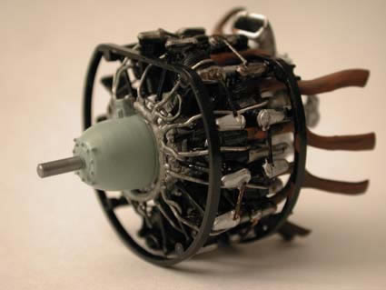 splendida figura. A questo punto del montaggio ho abbandonato l'ordine consigliato dalla Tamiya e mi sono dedicato all'assemblaggio dello splendido motore, composto da ben 32 pezzi. Si inizia unendo le due corone di cilindri e quelle delle aste dei bilanceri. Particolare attenzione bisogna dedicare al montaggio degli scarichi, ma francamente seguendo l'ordine consigliato dalla casa giapponese è praticamente impossibile sbagliare. Una volta terminato l'assemblaggio del tutto mi sono dedicato ad un minimo di dettaglio. Con un sottilissimo filo di stagno ho autocostruito i cavi delle candele, quindi sono passato alla verniciatura. I cilindri sono stati colorati con il nero semi-gloss X18 della Tamiya, le copertire delle valvole in flat alluminio XF16 così come gran parte del blocco motore. Altre parti del motore come la grossa presa d'aria superiore ancora in nero X18. Successivamente con il pennello a secco precedentemente passato nel flat alluminio ho ripassato i cilindri, mentre con un nero ad olio ho evidenziato in profondità i numerosi particolari del blocco motore. Grande cura ho dedicato nel trattare i tubi di scappamento per dare loro un colore che si avvicinasse il più possibile alla realtà. Ho usato vari strati di colore, da vari tipi di ruggine della Life Color, all'exhaust della Model Master, al nero e all'alluminio della Tamya. |